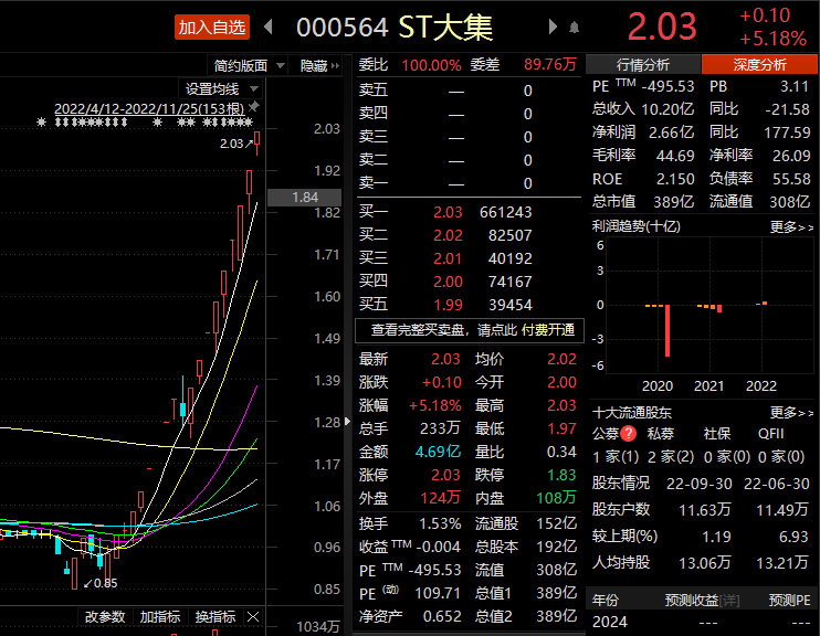 因此,自11月2日起,ST大集就踏上了一场股价狂飙之路,在18个交易日中,创下16个涨停板,公司股价也回升到2.03元,正努力摆脱退市风险。期间,ST大集的涨幅达到115.96%。