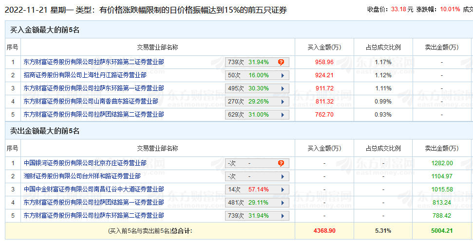 但11月21日天鹅股份复牌,当天的龙虎榜数据则显示,“拉萨天团”开始大量出现,买盘前五中有4个是东方财富营业部。天鹅股份在21日也再次涨停。