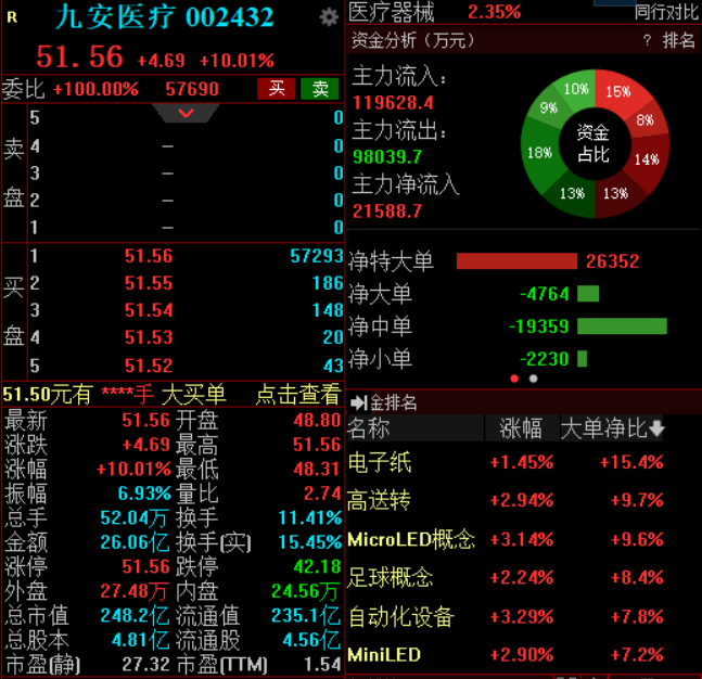 10月17日,九安医疗盘中触及涨停,截至收盘,报51.56元,换手率11.41%,市值248.2亿元。