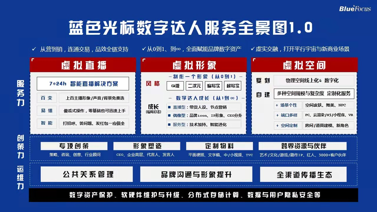 透过多轮战略合作可以看出,蓝色光标在虚拟直播、虚拟人和虚拟空间三大场景,基本上已经形成了完整的生态链。未来,随着蓝色光标持续加码元宇宙业务,在AI、AR/VR/MR、智能交互、游戏开发、引擎、私链、NFT铸造等方面,将会有更多的合作伙伴与蓝色光标共创元宇宙生态。而在元宇宙营销的基建底座,蓝色光标也已经对一些算力、开发的公司开展投资,未来将会与更多底层架构和后端基建的技术公司有更多的业务合作和能力互补。