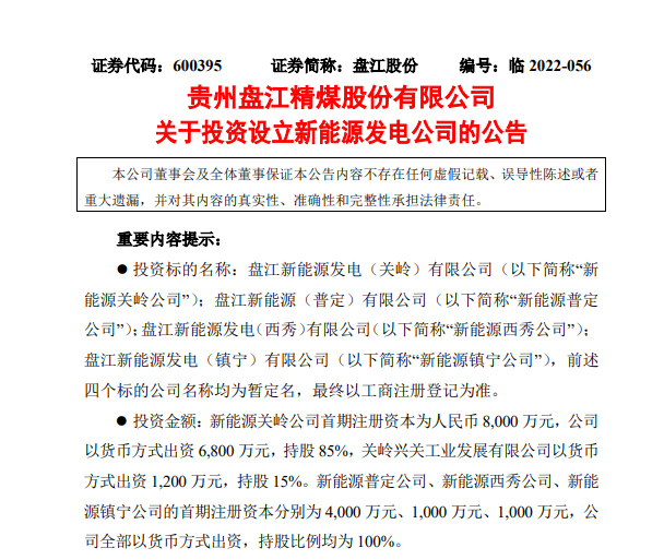 另一则公告披露,根据《战略合作框架协议》,4月20日,盘江股份投资设立全资子公司普定公司,负责开展盘江普定2×66万千瓦燃煤发电项目前期工作。