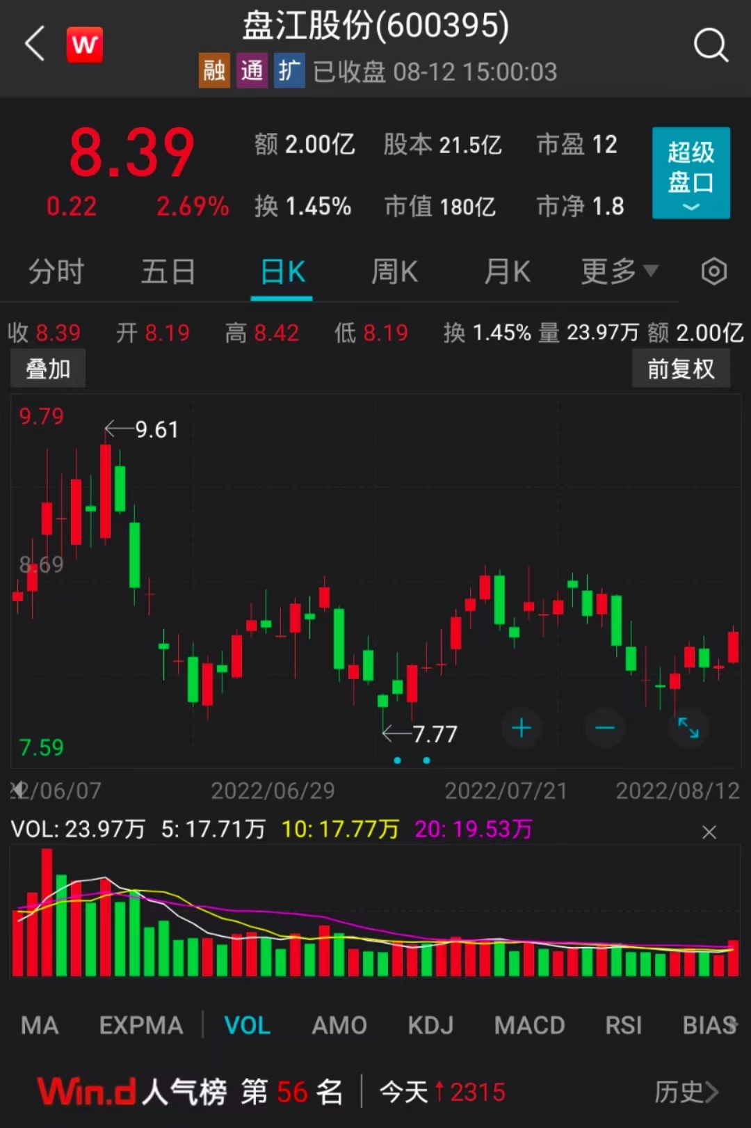 截至8月12日收盘,盘江股份股价报8.39元/股,市值180亿元。