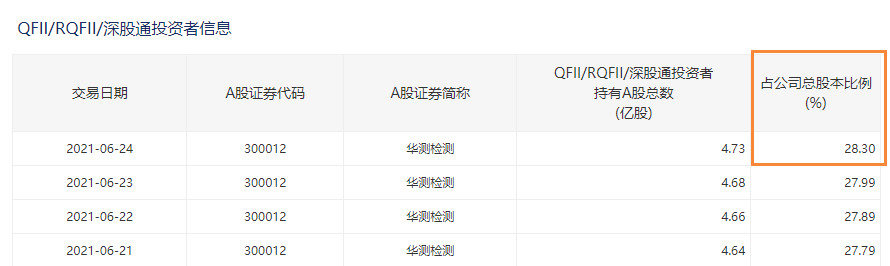 其中创业板华测检测昨日最新的外资持仓达到4.73亿股,持仓比例已超过28%。相关规定显示,所有境外投资者持有单个上市公司A股或境内挂牌股份的总和不得超过该公司股份总数的30%。而在实际操作中,外资持股比例达26%视为警戒点,28%则暂停外资购买。