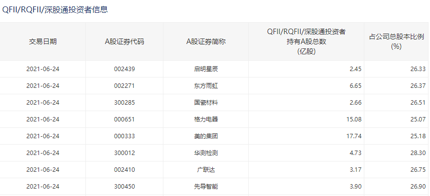 自去年QFII、RQFII实施新交易细则,将外资持股初始披露比例由26%调整至24%以来,外资持仓比例较高的数只个股连续登上预警“豪华列表”,美的集团、格力电器、先导智能、广联达、启明星辰、国瓷材料、东方雨虹以及华测检测本年度多次上榜。