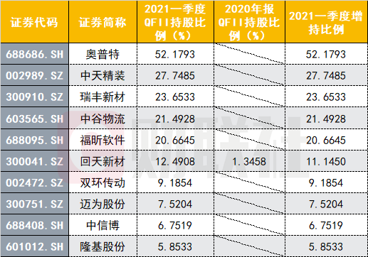 截止到昨日,陆股通持股市值已经达到28623亿元,较2020年底的23333亿元,提升比例超过22%。以合格境外机构投资者的持仓数据来看,2021年一季度,QFII增持今年上市的次新股奥普特比例最高,其次是中天精装、瑞峰新材、中谷物流、福昕软件。4600亿“光伏茅”隆基股份一季度也获QFII增持超5%。