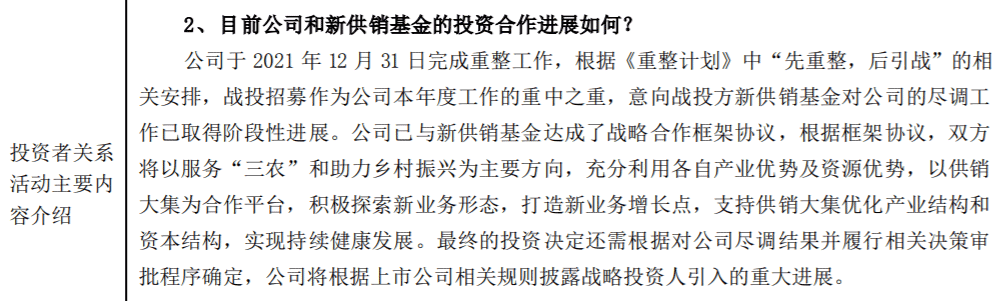 记者注意到,在此前异动公告中,ST大集曾表示目前新供销基金对公司的尽调工作已取得重要的阶段性进展,将尽快完成尽调工作,双方共同协商拟定下一步投资合作方案并推进协议签署。