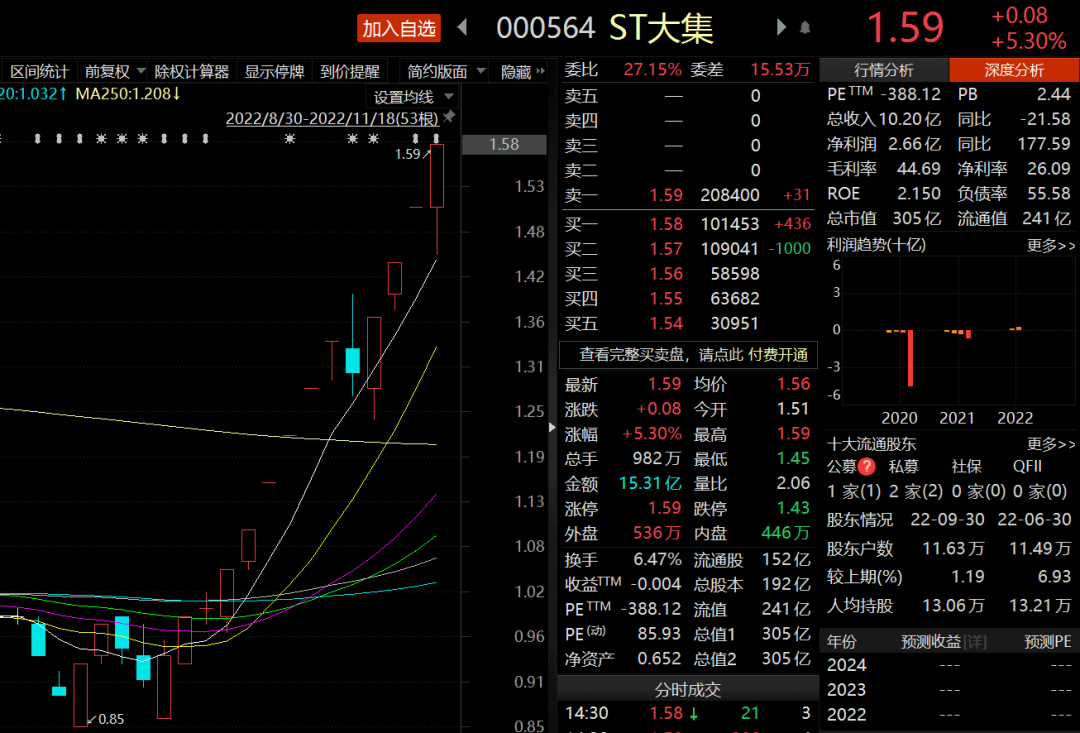 事实上,除了供销社概念,ST大集基本面并未发生实质变化。公司三季报显示,前三季度实现营收3.42亿元,同比降低11.07%;扣非后净利润仍未实现扭亏,亏损达到1.39亿元。
