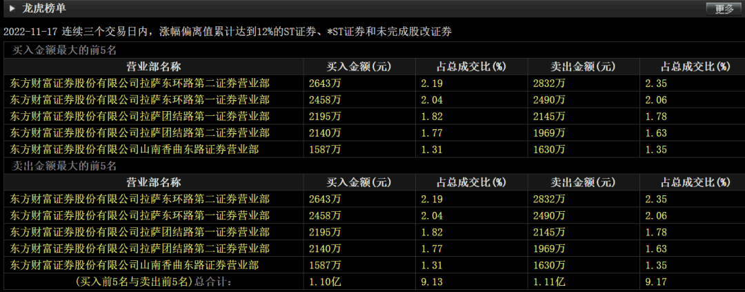公司11月17日晚的龙虎榜显示,东方财富拉萨东环路第二营业部、东环路第一营业部、团结路第一营业部、团结路第二营业部四个席位同时跻身买入和卖出前四席位。这四个席位在11月15日至17日三个交易日内合计买入ST大集9436万元,合计卖出9097万元。