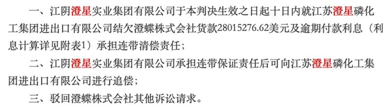 中国裁判文书网显示,澄蝶株式会社提起诉讼时,要求判令澄星集团支付逾期未付货款本金2801.53万美元,以及150.22万美元的利息,本息合计人民币2.08亿元。无锡法院判决澄星集团就其子公司结欠澄碟株式会社货款2801.53万美元及逾期付款利息承担连带清偿责任。