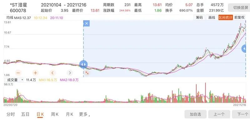 司法拍卖起拍价为8.07亿元,定价依据为90日均线价即11.53亿元;若以12月16日*ST澄星13.61元的收盘价计算,上述股份对应市值23.25亿元。当然,上述估值与*ST澄星股价年内飙升超过200%有关,但都远超2亿元。