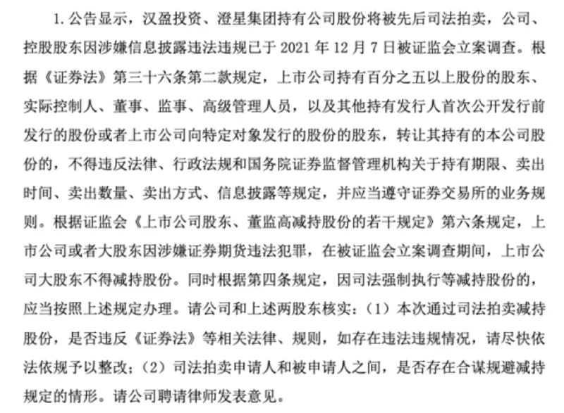上交所在16日下发的问询函中提出,根据证监会《上市公司股东、董监高减持股份的若干规定》第六条规定,上市公司或者大股东因涉嫌证券期货违法犯罪,在被证监会立案调查期间,上市公司大股东不得减持股份。同时根据第四条规定,因司法强制执行等减持股份的,应当按照上述规定办理。对此,上交所要求公司核实,本次通过司法拍卖公司股份,是否违反证券法等相关法律、规则;司法拍卖申请人和被申请人之间,是否存在合谋规避减持规定的情形。
