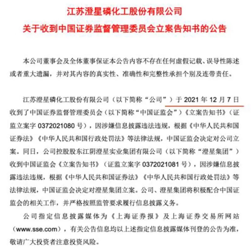 也就是在12月7日,*ST澄星收到中国证监会《立案告知书》,因涉嫌信息披露违法违规,中国证监会对公司立案。澄星集团也在同一日收到中国证监会《立案告知书》。