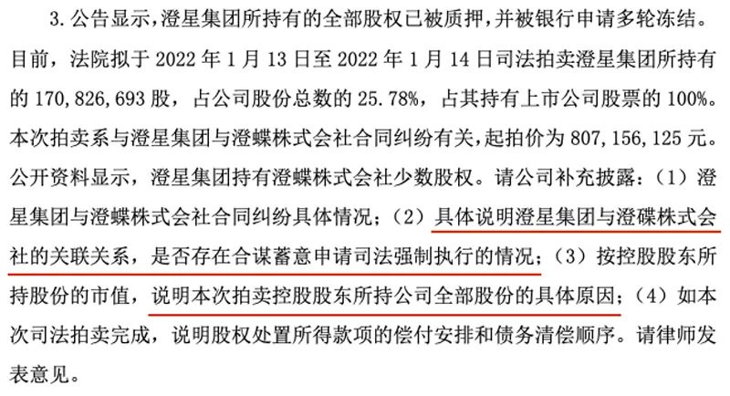 对此,上交所火速问询“是否存在合谋蓄意申请司法强制执行的情况”,以及“本次拍卖控股股东所持公司全部股份的具体原因”。