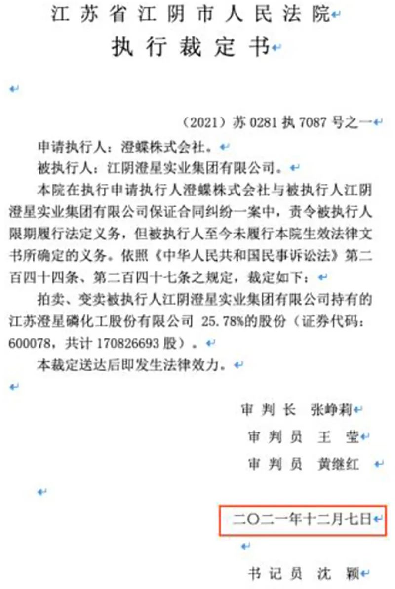 值得关注的是,虽然*ST澄星在公告中并未明确“近日”是哪日,但司法拍卖平台的一则附件显示,江阴法院的执行裁定书落款日期为2021年12月7日。