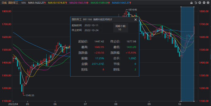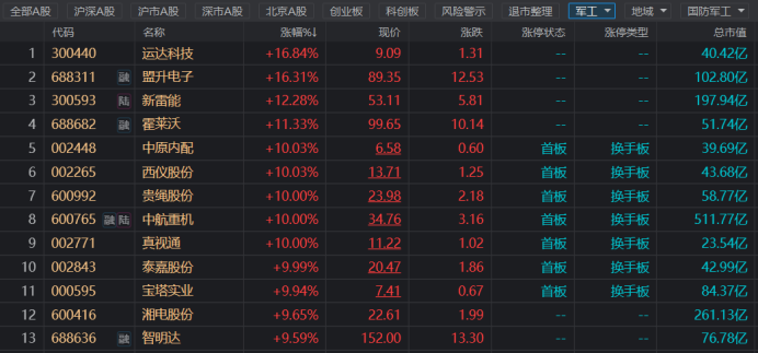 今日(10月24日),军工板块再度活跃,个股掀起涨停潮。截止收盘,中原内配、西仪股份、贵绳股份、中航重机、真视通等多股封板涨停,此外,运达科技、盟升电子、新雷能涨幅超10%。其中,500亿元级市值的中航重机近日持续走强,近9个交易日累计上涨近21%,且股价已逼近下半年最高点。