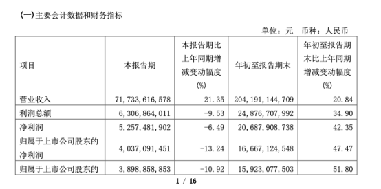 其中,第三季度收入为717.3亿元,同比增长21.4%,扣非净利润38.9亿元,同比下滑10.9%。