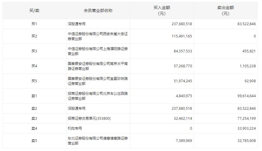 盘后数据显示,深股通买入2.38亿元并卖出8352万元,中信证券西安朱雀大街买入1.15亿元,中信证券上海溧阳路买入8435万元,一机构卖出3390万元。