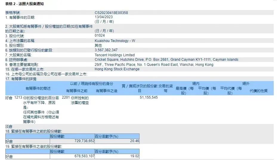 据港交所披露文件:4月13日,腾讯在快手的持股比例从20.46%降至19.02%。
