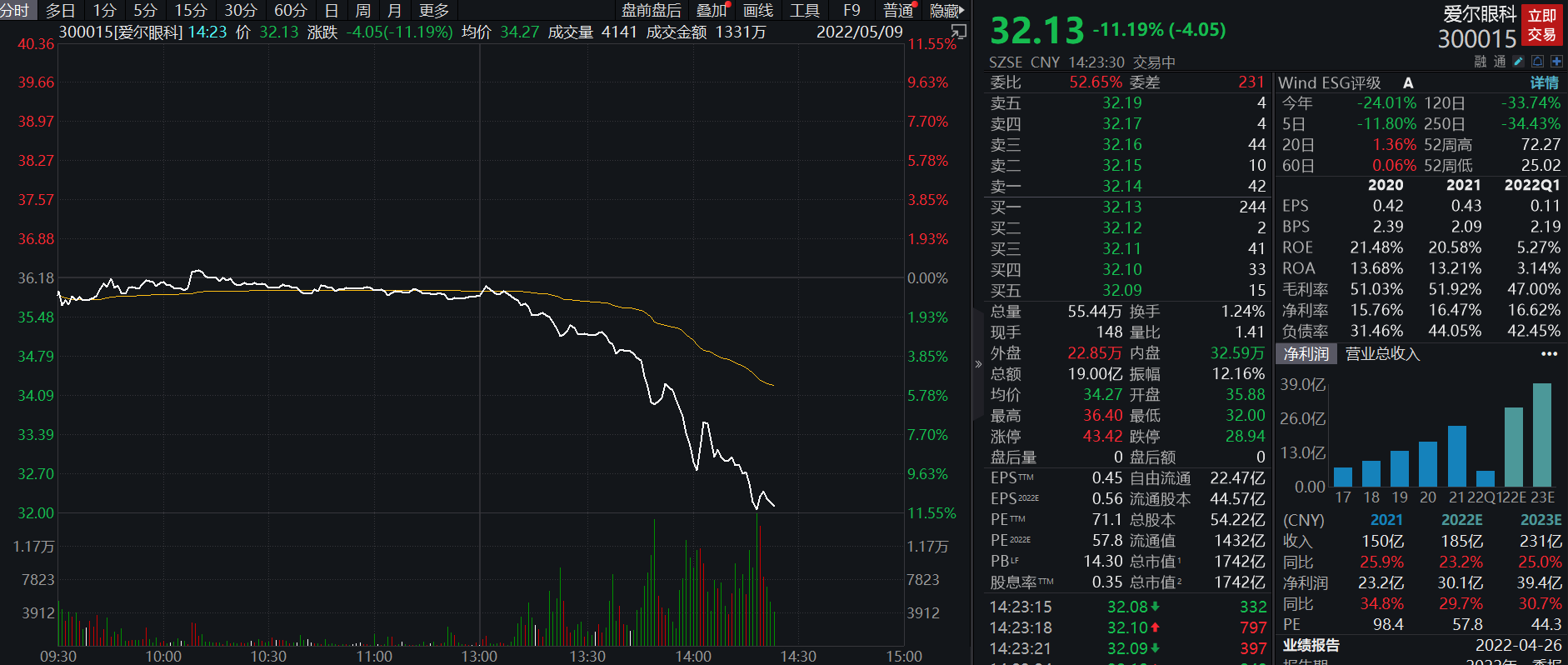 5月9日,爱尔眼科股价午后跳水,总市值回到1800亿元下方。截至发稿,爱尔眼科跌11%,报32.13元,成交额19亿元。