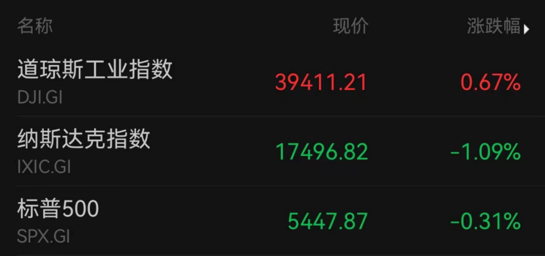 当地时间6月24日周一,美股三大股指涨跌不一。截至收盘,道指涨260.88点,涨幅为0.67%,报39411.21点;纳指跌192.54点,跌幅为1.09%,报17496.82点;标普500指数跌16.75点,跌幅为0.31%,报5447.87点。