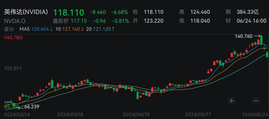 英伟达大跌6.68%,创下4月以来最大单日跌幅,收盘报118.110美元,最新市值为2.91万亿美元。连续三天的下跌使英伟达的市值蒸发了约4300亿美元,总市值跌回3万亿美元门槛以下。上周,英伟达曾短暂夺得全球市值第一公司的宝座。Allspring Global Investments投资组合经理内维尔·贾韦里表示:“短期内,投资者可能会开始对人工智能产生疲劳。”尽管如此,英伟达仍然受到华尔街的青睐。据彭博社数据显示,超过90%的分析师建议买入英伟达股票,这些分析师对于英伟达的目标价较当前股价高出约12%。