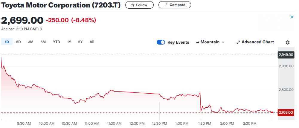 然而,这份还算平稳落地的财报并未给丰田带去股价的喜报。财报发布前,该公司股价已经下跌了5.5%,随后则进一步下跌,截至今日收盘,累计跌幅达到8.48%。