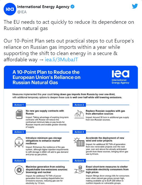 国际能源署提出的计划名为《关于减少欧盟对俄罗斯天然气依赖的10点方案》,该计划是一系列旨在促使欧洲能源供应多样化、加速向可再生能源发展以及提升能源效率的行动的集合。