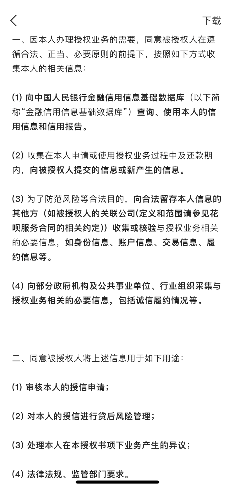 当前,越来越多的用户可以在自己的花呗页面上收到征信授权协议,新用户注册时也需签署《个人金融信息使用及征信查询报送授权书》。