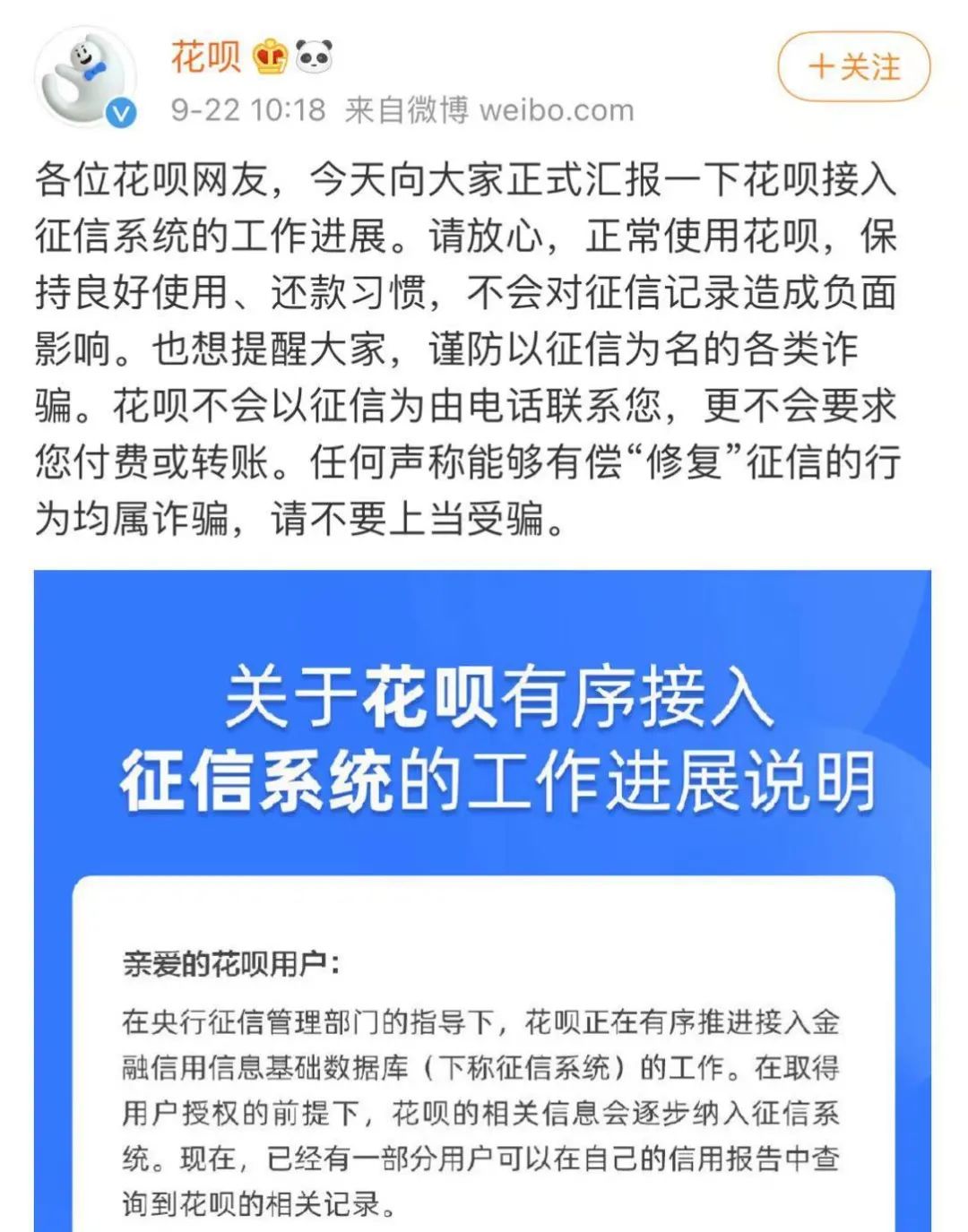 中国证券报记者9月22日从花呗方面获悉,在央行征信管理部门的指导下,花呗正逐步推进接入央行征信系统的工作。目前,在获得用户授权的基础上,部分用户已经能够在自己的征信报告中查询到花呗记录,未来征信服务将逐步覆盖全部用户。