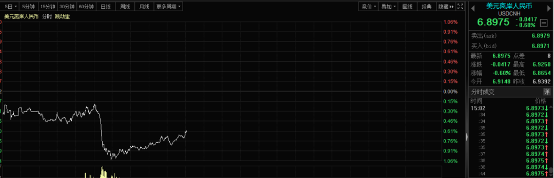 人民币表现强势,离岸人民币一度大涨超500点,最近两个交易日,离岸人民币涨幅一度超1000点。