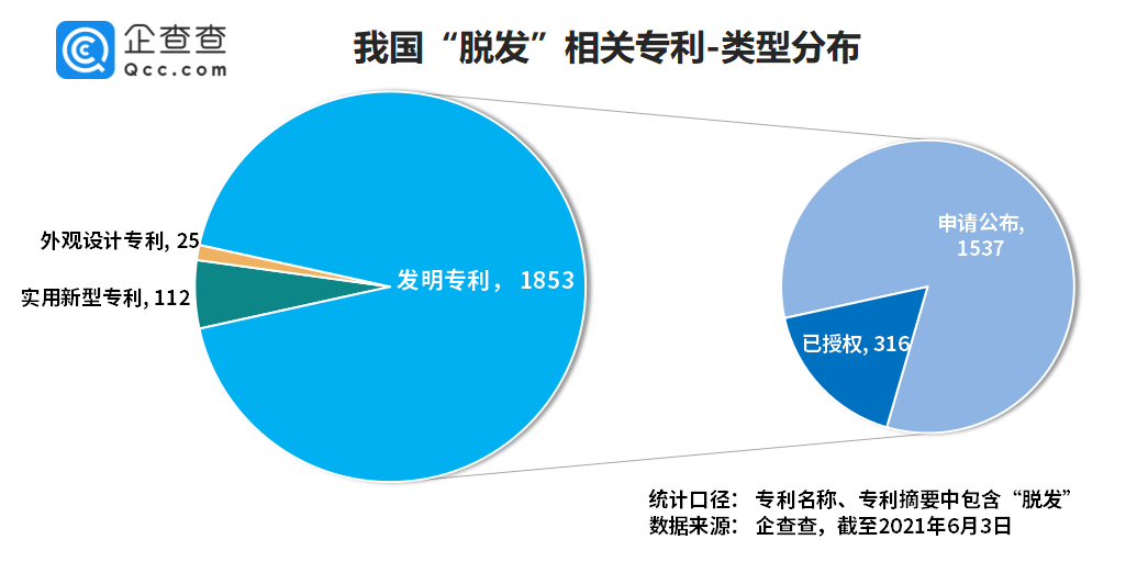 治疗脱发并不是“无中生有”的一场魔术,而是通过毛发移植技术,将人的头皮毛囊进行“搬家”,在社会发展的驱动下,医学技术已经成为其存在的核心竞争力,数据显示,从“脱发”相关专利的类型来看,发明专利数量最多,共1853条,占比93%。其次是实用新型专利,共有112条,最少的是外观设计专利,仅有25条。科技的发展将进一步推动植发行业的扩展升级。