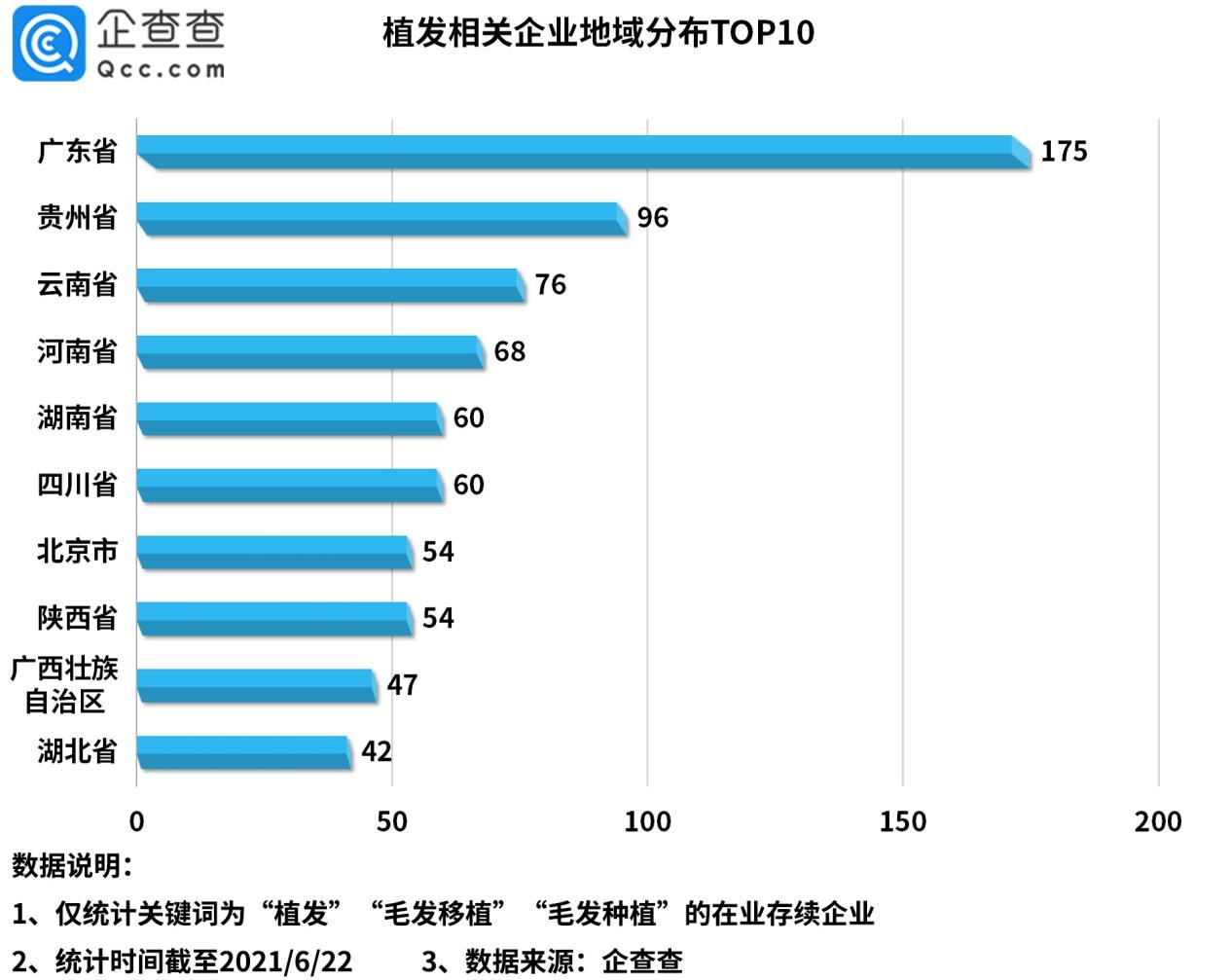 随着颜值经济的发展,脱发人群越来越关注自己的外在形象,企查查数据显示,国内植发相关企业广东省最多,达175家,占总量的16%。贵州、云南次之。