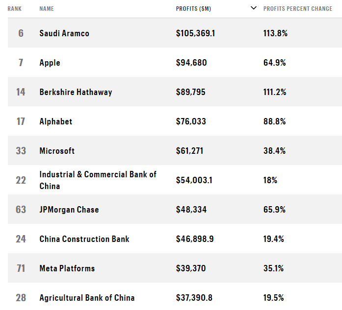 利润榜上,沙特阿美以1,053.69亿美元位居榜首,其次为苹果公司、伯克希尔-哈撒韦、谷歌母公司Alphabet和微软,工行、建行、农行中国三大商业银行继续位列前十位。