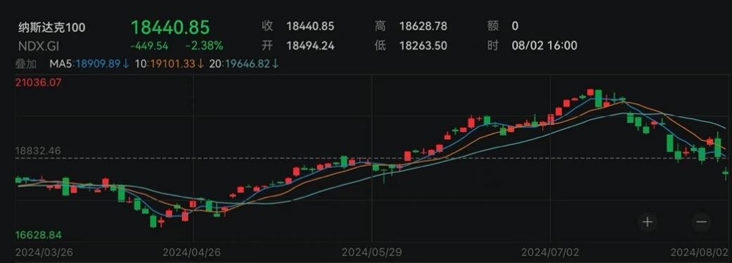 当地时间8月2日周五,美股三大股指全线收跌。截至收盘,道指跌610.71点,跌幅为1.51%,报39737.26点;纳指跌417.99点,跌幅为2.43%,报16776.16点;标普500指数跌100.12点,跌幅为1.84%,报5346.56点。