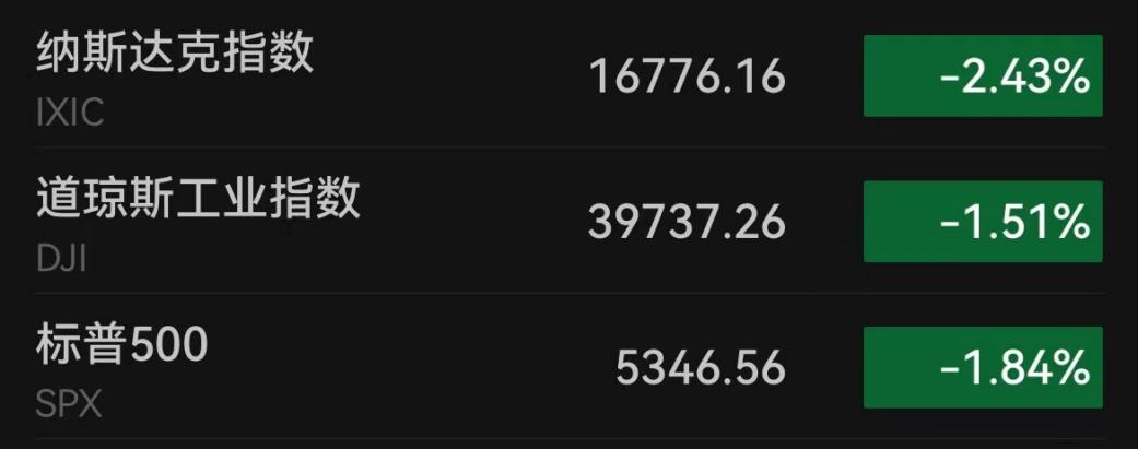 截至收盘,道指跌1.51%,纳指跌2.43%,标普500指数跌1.84%。