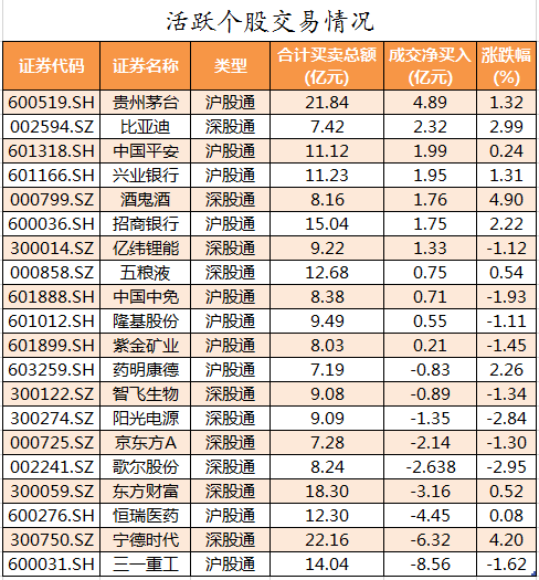 活跃个股方面,贵州茅台、比亚迪、中国平安、兴业银行、酒鬼酒北向资金净买入较多,净买入金额分别为4.89亿元、2.32亿元、1.99亿元、1.95亿元、1.76亿元。三一重工、宁德时代、恒瑞医药、东方财富北向资金净卖出较多,净卖出金额分别为8.56亿元、6.32亿元、4.45亿元、3.16亿元。