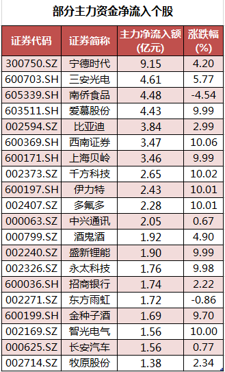 具体到个股来看,41股主力资金净流入超亿元。其中,宁德时代、三安光电、南侨食品、爱慕股份、比亚迪主力资金净流入居前,净流入金额分别为9.15亿元、4.61亿元、4.48亿元、4.43亿元、3.84亿元。