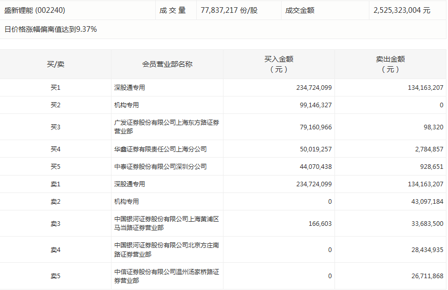 盛新锂能今天涨停。盘后数据显示,2个机构出现在龙虎榜单上,合计净买入0.56亿元;广发证券股份有限公司上海东方路证券营业部买入7916.1万元,同时卖出9.83万元;中国银河证券股份有限公司上海黄浦区马当路证券营业部买入16.66万元,同时卖出3368.35万元。