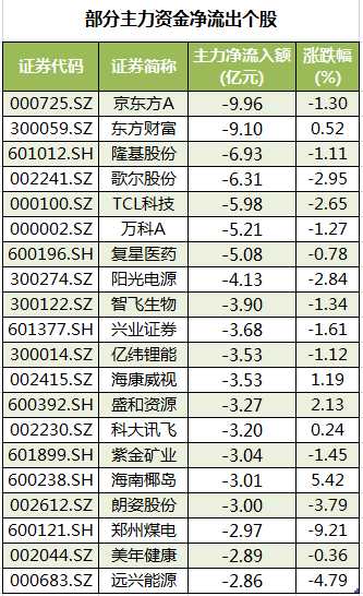 此外,90股被主力资金净卖出超亿元。其中,京东方A、东方财富、隆基股份、歌尔股份、TCL科技主力资金净流出较多,净流出金额分别为9.96亿元、9.1亿元、6.93亿元、6.31亿元、5.98亿元。