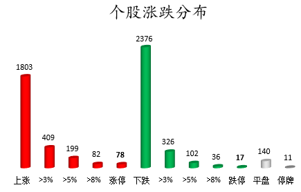 截至收盘,沪深两市合计1803只个股上涨,2376只个股下跌,平盘个股140只,停牌的个股11只。不含当日上市新股,共有78只个股涨停,17只个股跌停。