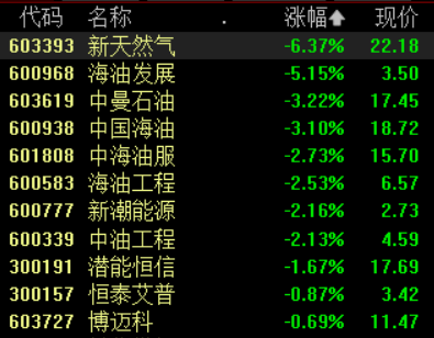 5月4日,油气开采及服务板块走低。截至发稿,新天然气跌超6%,海油发展跌超5%,中曼石油、中国海油、中海油服、海油工程等多股飘绿。