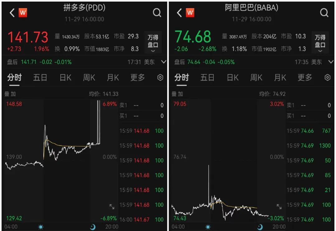 截至收盘,拼多多涨幅收窄至1.96%,市值为1883亿美元;阿里巴巴下跌2.68%,市值为1902亿美元,重回“电商一哥”宝座。