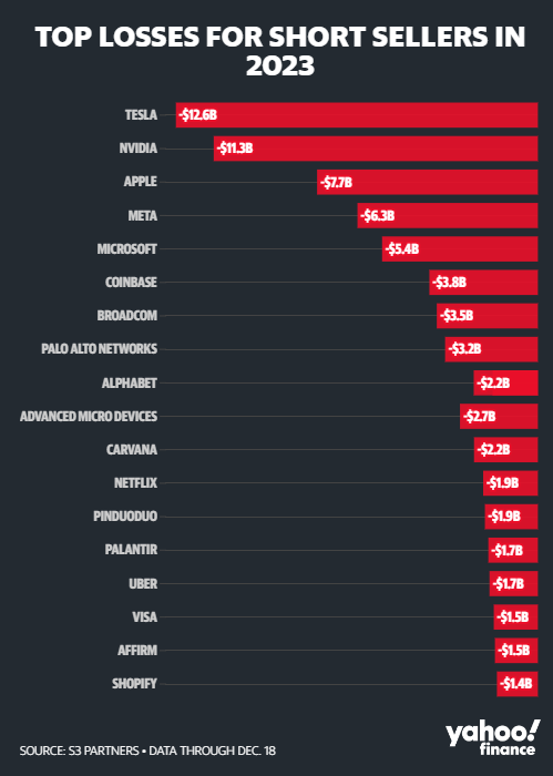 具体而言,空头今年在特斯拉股票上“栽得最惨”。其次是英伟达、苹果、Meta和微软,空头损失分别为113亿美元、77亿美元、63亿美元和54亿美元。