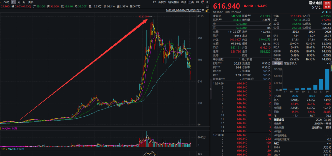 数据显示,2022年7月至2024年3月期间,超微电脑的股价涨幅超过30倍,股价最高触及1229美元/股,市值一度超过700亿美元。不过,自今年3月历史高点以来,超微电脑股价已回调近50%,截至周二收盘时,公司市值为361亿美元。