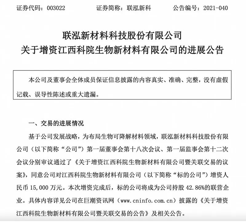 近日,联泓新科公告,为布局生物可降解材料领域,拟对江西科院生物新材料有限公司(下称“科院生物”)进行增资,增资金额为1.5亿元,增资后联泓新科将持有科院生物42.86%的股权。
