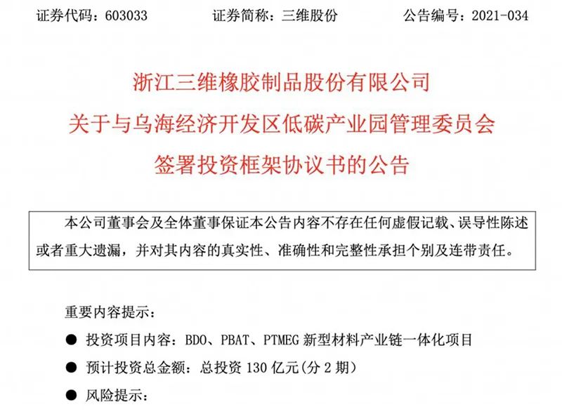 三维股份的投资也是大手笔。公司拟在内蒙古乌海经济开发区投资建设新型材料产业链一体化项目,生产1,4丁二醇,并进一步向下游投资建设可降解塑料、高端聚醚材料以及部分精细化工产品生产线。