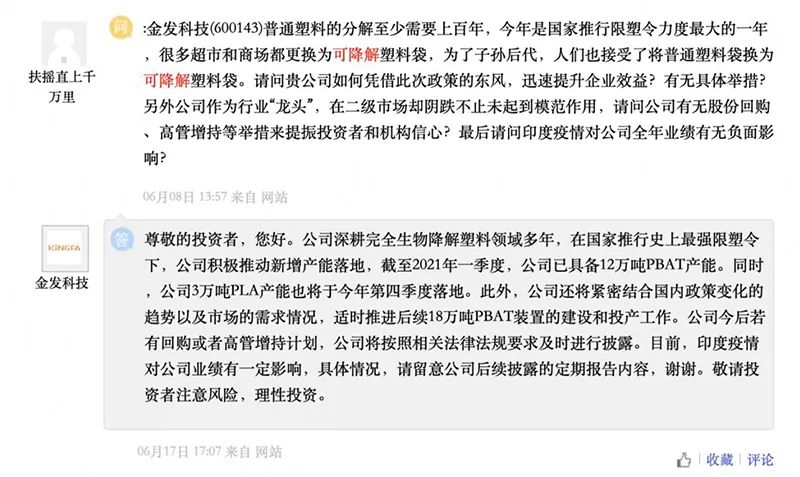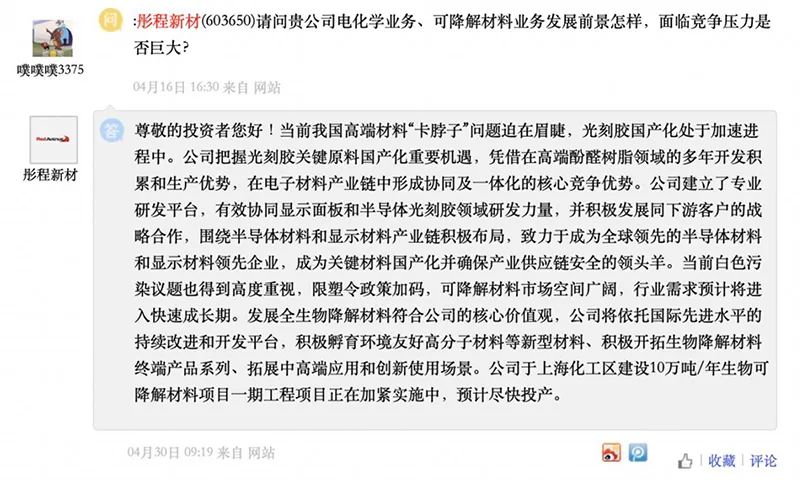 此前,公司在投资者互动平台表示,当前白色污染议题得到高度重视,限塑令政策加码,可降解材料市场空间广阔,行业需求预计将进入快速成长期。发展全生物降解材料符合公司的核心价值观,公司将依托国际先进水平的持续改进和开发平台,积极孵育环境友好高分子材料等新型材料、积极开拓生物降解材料终端产品系列、拓展中高端应用和创新使用场景。公司于上海化工区建设10万吨/年生物可降解材料项目一期正在加紧实施中,预计尽快投产。
