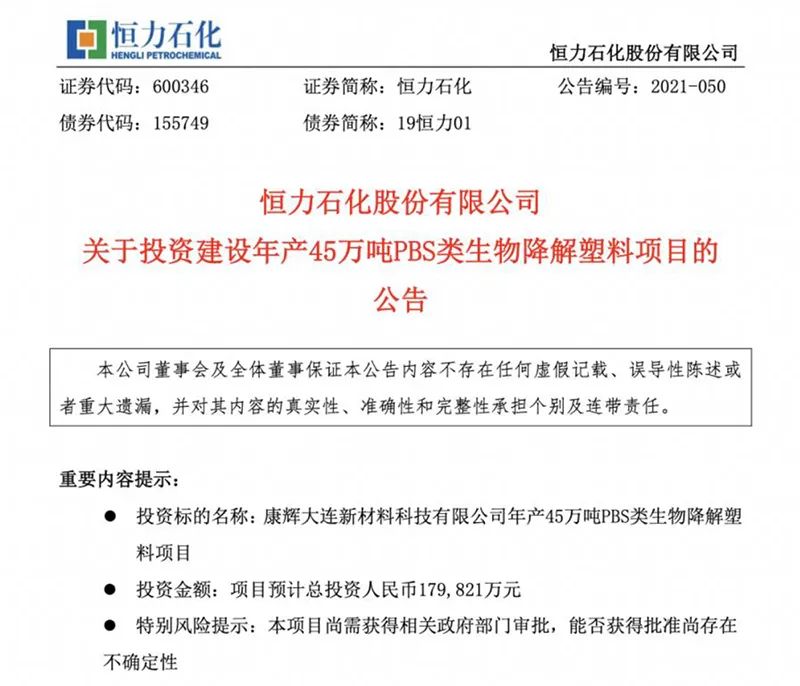 其中,公司下属公司康辉大连新材料科技有限公司拟投资17.98亿元建设年产45万吨PBS类生物降解塑料项目。公司表示,该项目能有效扩大公司可降解新材料板块的产能和规模,提高可降解塑料市场占有率。该项目达产达效后,预计可实现年销售收入100.58亿元,年均利润总额20.16亿元。