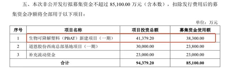 日前,道恩股份公告,拟定增8.51亿元投资生物可降解塑料(PBAT)等两个项目及补充流动资金。