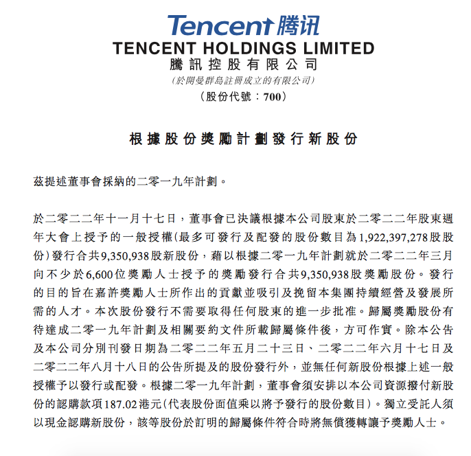 11月17日,腾讯在港交所发布公告称,根据公司股东2022年周年大会授予的一般授权发行合计935万股新股份,根据2019年计划于2022年3月向不少于6600位奖励人士,授予奖励发行合并935万股奖励股份。
